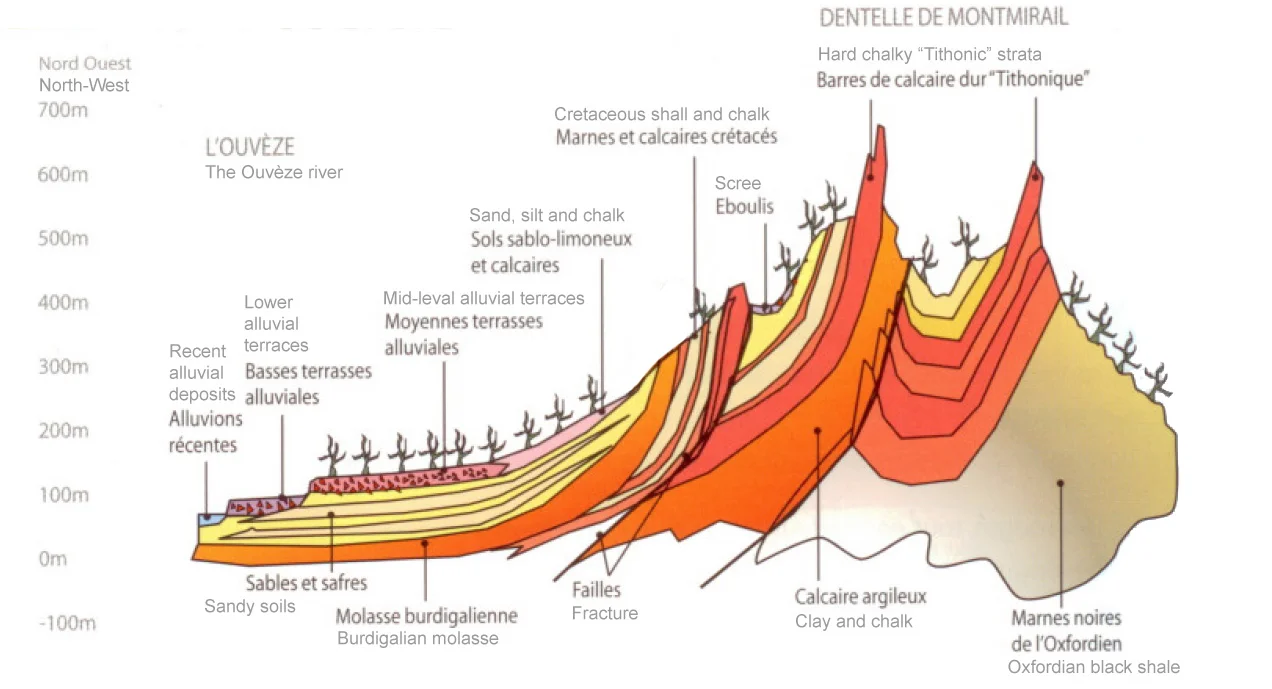 Xavier: The rich mineral content. The distinctive structure of our soil with its basalt content provides a signature to all the Chêne Bleu wines, regardless of varietal or winemaking. The tectonic activity that led to the creation of Mont Ventoux and its foothills has eroded over time, revealing a diverse cross-section of geological strata containing components from the Triassic, Jurassic and Cretaceous periods. The blend creates a very interesting cocktail of minerals. This in turn adds complexity and a mineral signature to all our wines. The topsoil is clay and chalk with plenty of unforgiving, sharp-edged stones.
