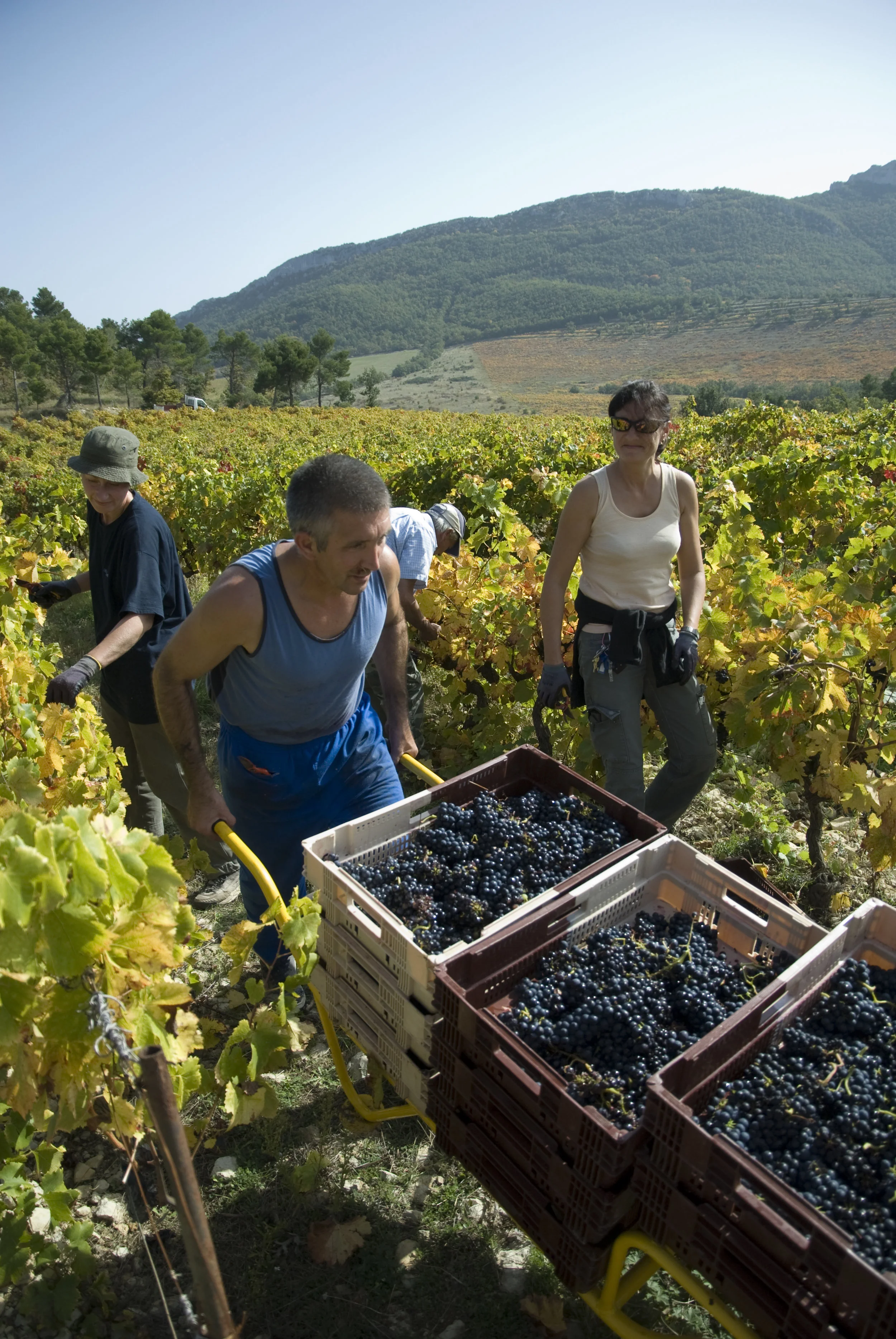 Bénédicte: We pick the fruit entirely by hand, placing the whole bunches carefully into shallow crates so that the berries remain whole and keep their ripe juice. We have worked so hard with the grapes all year; we are not going to damage them at the last minute!